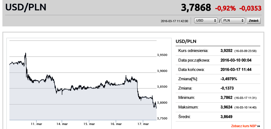 Chwilę przed południem kurs eurodolara kształtował się na poziomie 1,1326, a więc o niemal 1% wyższym niż w środę. Równie znaczące zmiany obserwowano na parze USD/PLN (-0,93%). Za jednego dolara należało zapłacić 3,7868 zł, najmniej od 20 tygodni. Po raz ostatni dolar w okolicach tych poziomów widziany był w październiku 2015 roku. Warto dodać, że jeszcze na początku bieżącego roku za "zielonego" momentami płacono nawet 4,15 zł.