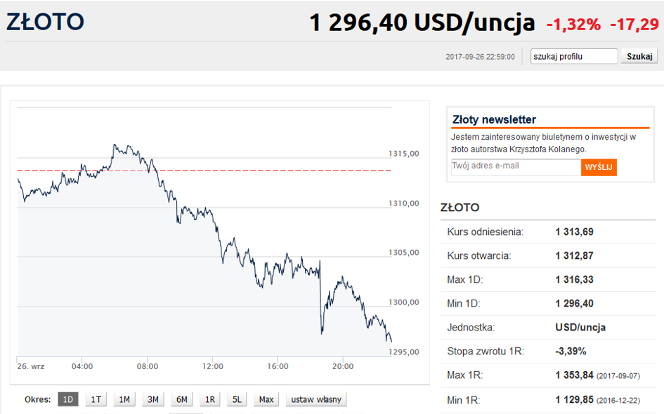 W konsekwencji dolar umocnił się względem euro – kurs EUR/USD spadł poniżej 1,18 i znalazł się na najniższym poziomie od miesiąca. Aprecjacja dolara uderzyła w notowania złota – królewski metal został przeceniony o 1,3%, wymazując poniedziałkową zwyżkę i powracając poniżej 1.300 USD/oz.