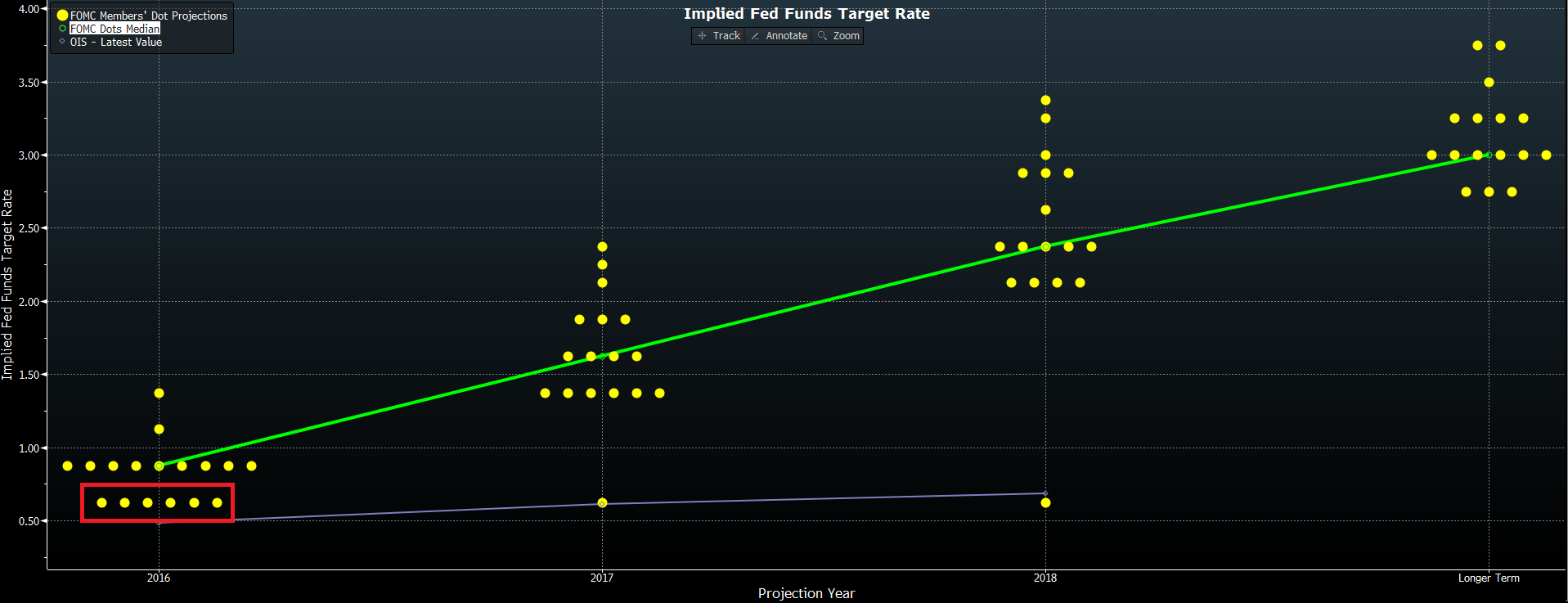 Mediana oczekiwań stóp procentowych w 2016 roku pozostała na niezmienionym poziomie. Zmieniło się natomiast nastawienie członków Rezerwy Federalnej co do przyszłych podwyżek. W marcu tego roku tylko jeden członek FED był za jedną podwyżką stóp procentowych, natomiast teraz jest ich sześciu.