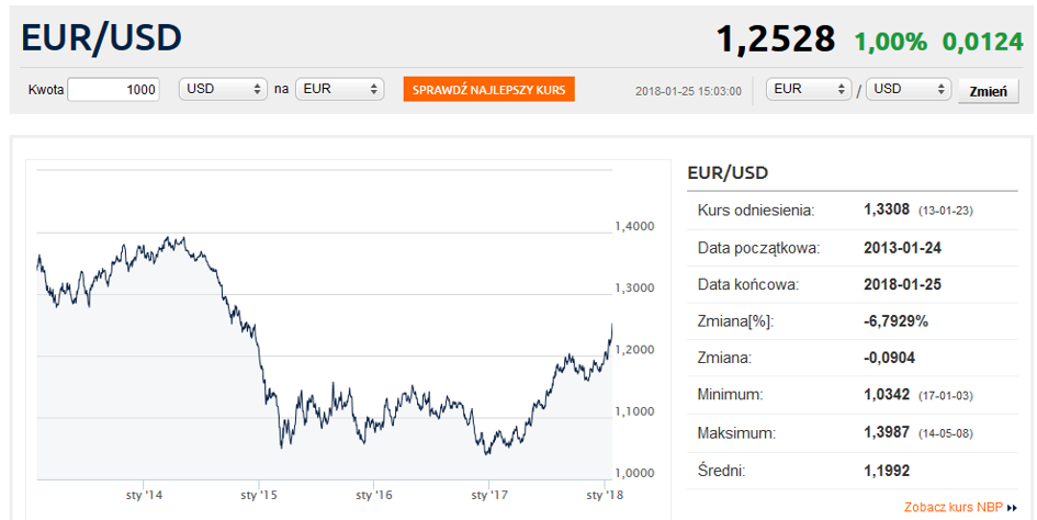 Rosnący kurs EUR/USD na polskim rynku walutowym objawia się pikującymi notowaniami pary dolar-złoty. Amerykańska waluta jest wyceniana na nieco ponad 3,30 zł – a więc najniżej od października 2014 roku. Tylko dzisiaj dolar potaniał o ponad trzy grosze. Od początku 2018 roku „zielony” potaniał aż o 17 groszy.