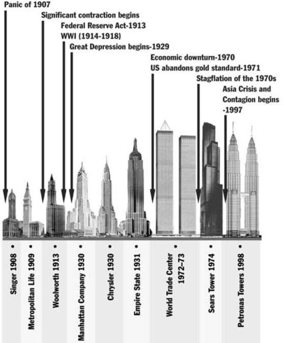 Nie jest przypadkiem, że w XX wieku budowę wszystkich najwyższych budynków świata kończono w fazie głębokiego kryzysu gospodarczego, choć ich budowniczowie rozpoczynali pracę w warunkach prosperity i hossy na rynku nieruchomości. Pierwszym zaobserwowanym przypadkiem były nowojorskie biurowce Singer Building i Metropolitan Life Insurance Company Tower, których budowa rozpoczęła się tuż przed wybuchem bankowej paniki w roku 1907. Znacznie bardziej spektakularnym przykładem są jednak Empire State Building, 40 Wall Street oraz Chrysler Building ukończone w czasach Wielkiej Depresji lat 30., a których budowę zainicjowano w czasie boomu zakończonego krachem roku 1929. Pierwszy z tej trójki był przez cztery dekady najwyższym budynkiem świata, ale ze względu panujące w nim pustostany przylgnęła doń nazwa Empty State Building. Inwestycja ta zaczęła na siebie zarabiać dopiero 20 lat od ukończenia.