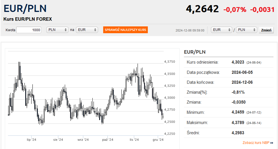 Podczas czwartkowej konferencji szefa NBP kurs euro zaliczył spadek z ok. 4,2750 do 4,2570 zł. W ten sposób notowania euro znalazły się najniżej od końcówki września. W tym kontekście kluczowa wydaje się strefa 4,2450-4,2500 zł wyznaczana przez tegoroczne minima na parze euro-złoty. W 2024 roku kurs EUR/PLN wahał się w przedziale 4,2440-4,4055 zł, w kwietniu, maju, lipcu i wrześniu schodząc do linii 4,25 zł i wyznaczając postcovidowe minima.