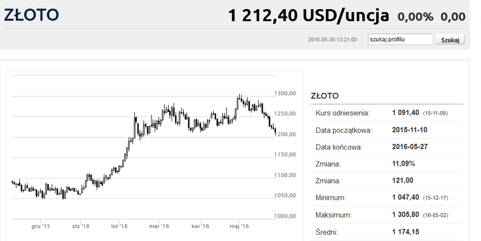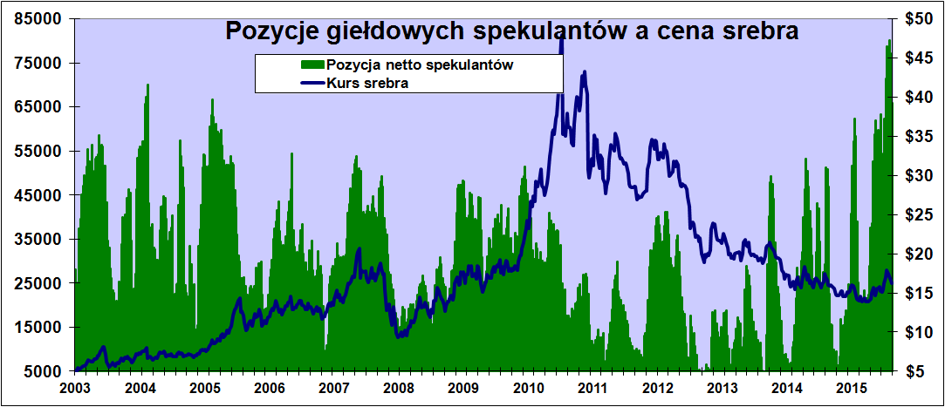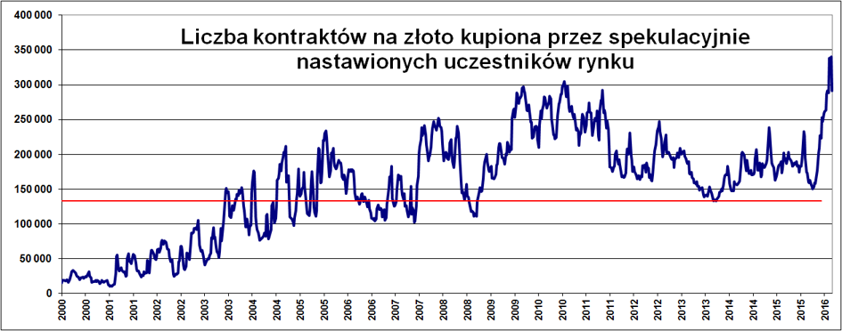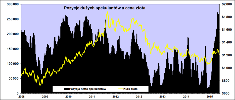 Na początku maja SPN w nowojorskich kontraktach na złoto sięgnęła rekordowych 271 648 kontraktów, każdy opiewający na sto uncji. Tak silne zaangażowanie „dużych spekulantów” utrzymało się przez następne dwa tygodnie, po czym odnotowano silną, aż 22-procentową redukcję. Gdy w grudniu 2015 roku kurs złotych kontraktów dołował na poziomie 1.047 USD/oz., zaangażowanie spekulacyjne było najniższe od 13 lat.