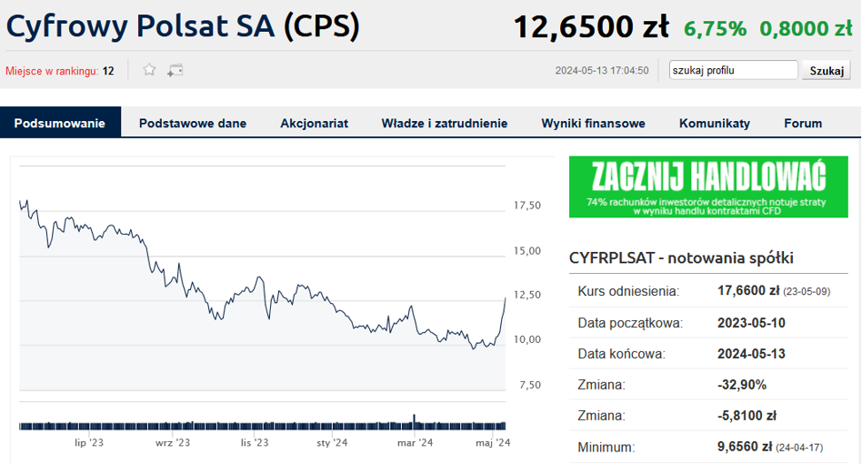 W minionym tygodniu akcje Cyfrowego Polsatu zyskały 18,76 proc., a w poniedziałek 13 maja kontynuowały trend zwyżkowy, rosnąc o kolejne 6,75% i kończąc sesję na poziomie 12,65 zł. Jeszcze na początku tego miesiąca można było je kupić, płacąc mniej niż 10 zł.