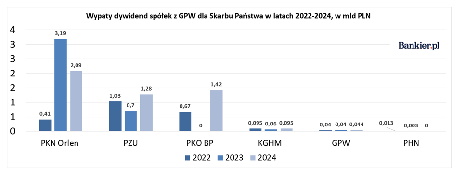 Jak przekazał ostatnio minister aktywów państwowych w wywiadzie dla PAP, na podstawie uchwał walnych zgromadzeń akcjonariuszy, w tym roku suma należnych dywidend to 5,4 mld zł. Największe spółki z GPW decydujące o sumarycznej skali uchwaliły w tym roku około 4,8 mld zł wypłat dla Skarbu Państwa. Dochodzą do tego wypłaty od innych spółek spoza giełdy, jak Totalizator Sportowy czy Polska Wytwórnia Papierów Wartościowych.