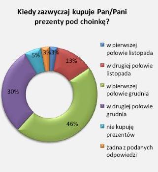 Polacy nie mają w zwyczaju kupować prezentów świątecznych z dużym wyprzedzeniem, dlatego też gorączka przedświątecznych zakupów przypada u nas na miesiąc grudzień. Jak wynika z raportu Ceneo.pl, najwięcej osób kupuje prezenty pod choinkę w pierwszej połowie grudnia – 46 %. Całkiem spora część ankietowanych zostawia zakup podarunków na ostatnią chwilę – 30% osób wskazało na drugą połowę grudnia.