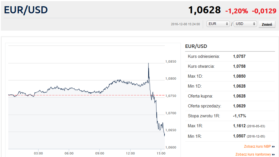 ograniczenie miesięcznego limitu programu luzowania ilościowego. Jednocześnie wydłużony został czas trwania programu. W reakcji na słowa prezesa EBC, euro wyraźnie się osłabiło.