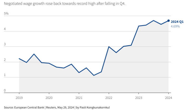 Jednakże przeciwko poluzowaniu polityki monetarnej w strefie euro przemawia nie tylko uporczywie wysoka i trwała inflacja w sektorze usług, ale też napędzający ją wzrost płac. W I kwartale stawki negocjowane w układach zbiorowych (czyli przez związki zawodowe) w eurolandzie podniosły się o 4,69%. Jest to zatem wzrost równie szybki jak w 2023 roku i raczej nie jest spójny z 2-procentowym celem inflacyjnym EBC. Może się zatem okazać, że cel ten długo pozostanie nieosiągalny.
