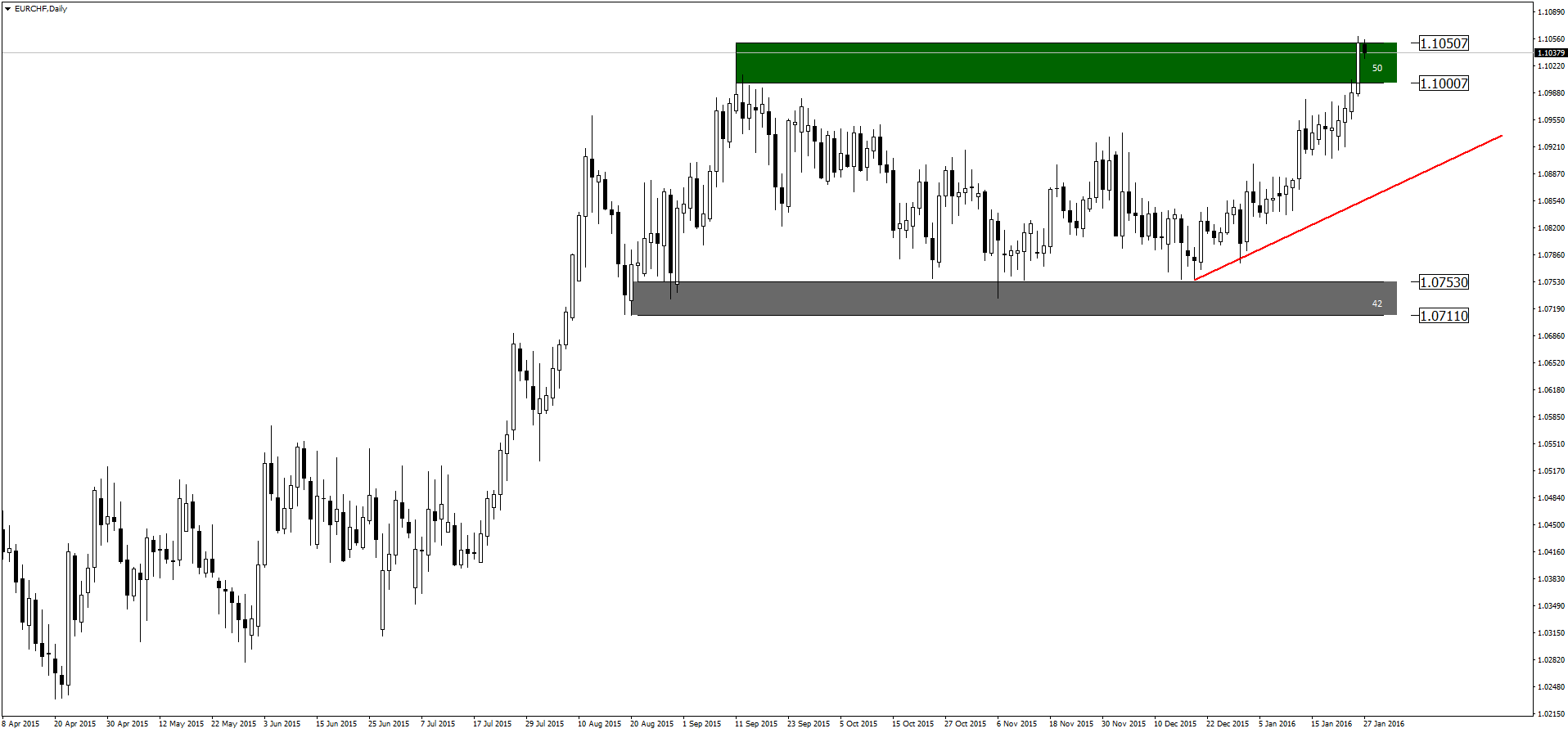 Para walutowa EUR/CHF po wczorajszym wystrzale po raz kolejny znalazła się w strefie podaży. Dopóki nie przebijemy danego oporu to bazowym scenariuszem pozostaje w dalszym ciągu konsolidacja na wykresie dziennym. Tak taniego franka szwajcarskiego nie widzieliśmy od dawna, SNB oficjalnie może wyjechać na ferie zimowe, aktualny poziom 1,10 jest na rękę szwajcarom, którzy zawsze dążą do osłabienia swojej waluty. Strefa popytu znajduje się w przedziale 1,070-1,075. Gdyby jednak bykom udało się pokonać ostatni szczyt to w przyszłości będziemy mogli zmierzać do poziomu 1,15.