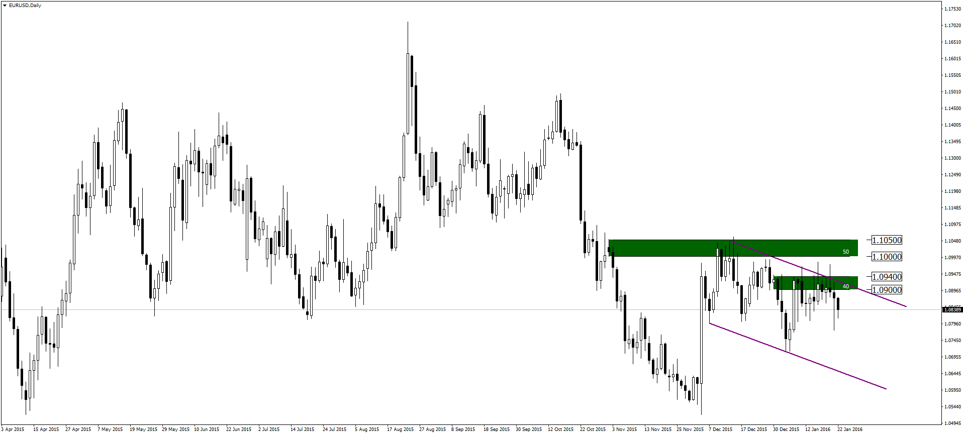 Na wykresie dziennym po wczorajszej konferencji niedźwiedzie z impetem odbili się od oporu 1,090-1,094. Aktualnie kurs może zmierzać do ostatniego minimum w okolicy 1,070.