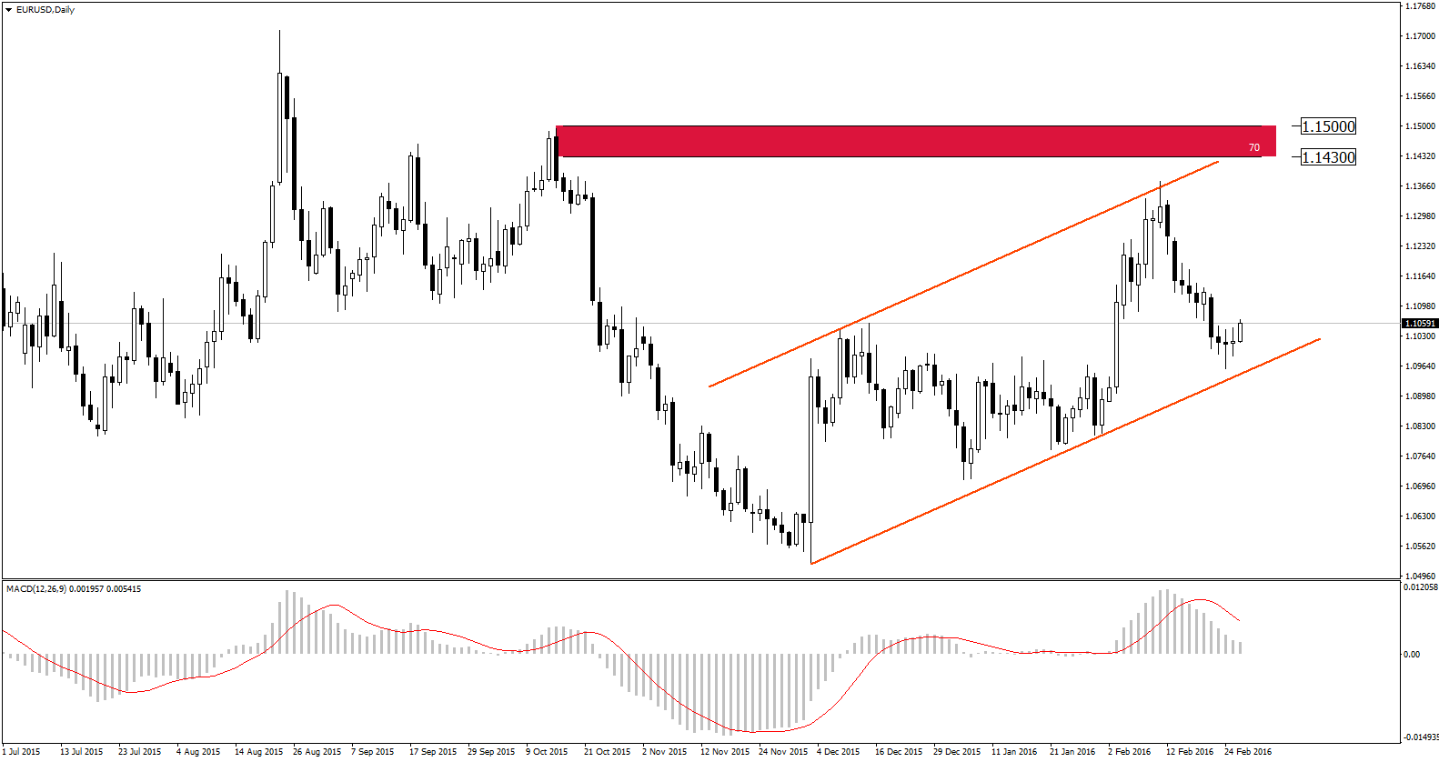 Wykres dzienny zawrócił z poziomu dolnego ograniczenia 3-miesięcznego kanału wzrostowego. Do momentu aż nie nastąpi wybicie dołem z kanału należy go uznawać za podstawową formację wyznaczającą wahania EUR/USD w przyszłości. To oznacza, że na gruncie AT, pomimo pewnego pogorszenia sytuacji na podstawowych wskaźnikach (np. MACD), obecnie należy zakładać ruch w kierunku górnego ograniczenia kanału.