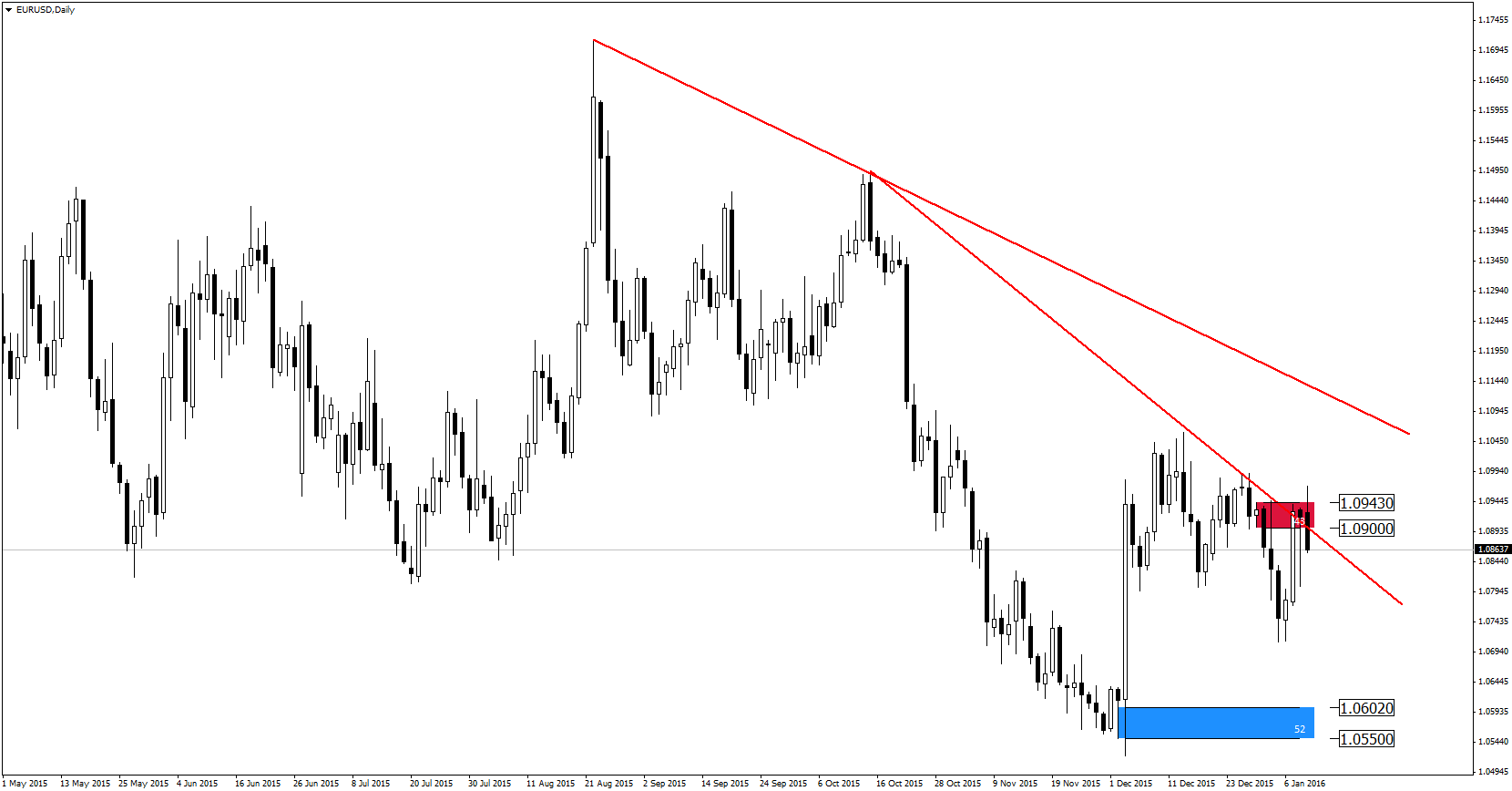 Na parze walutowej EUR/USD znajdujemy się blisko dziennego oporu w okolicy 1,090-1,094. Pokonanie danego oporu nie będzie takie łatwe, ponieważ w tym miejscu przebiega również linia trendu spadkowego. Dzisiejszego dnia bykom udało się na chwilowe wybicie ponad dzienny opór oraz linie trendu spadkowego, jednakże po chwili niedźwiedzie zanegowali cały ruch wzrostowy. Wybicie się ponad wsparcie będzie mogło oznaczać większe oraz mocniejsze wzrosty na danej parze walutowej. Bazowym scenariuszem w dalszym ciągu pozostanie umacnianie się dolara amerykańskiego w stosunku do euro w okolicę ostatnich minimów 1,072.