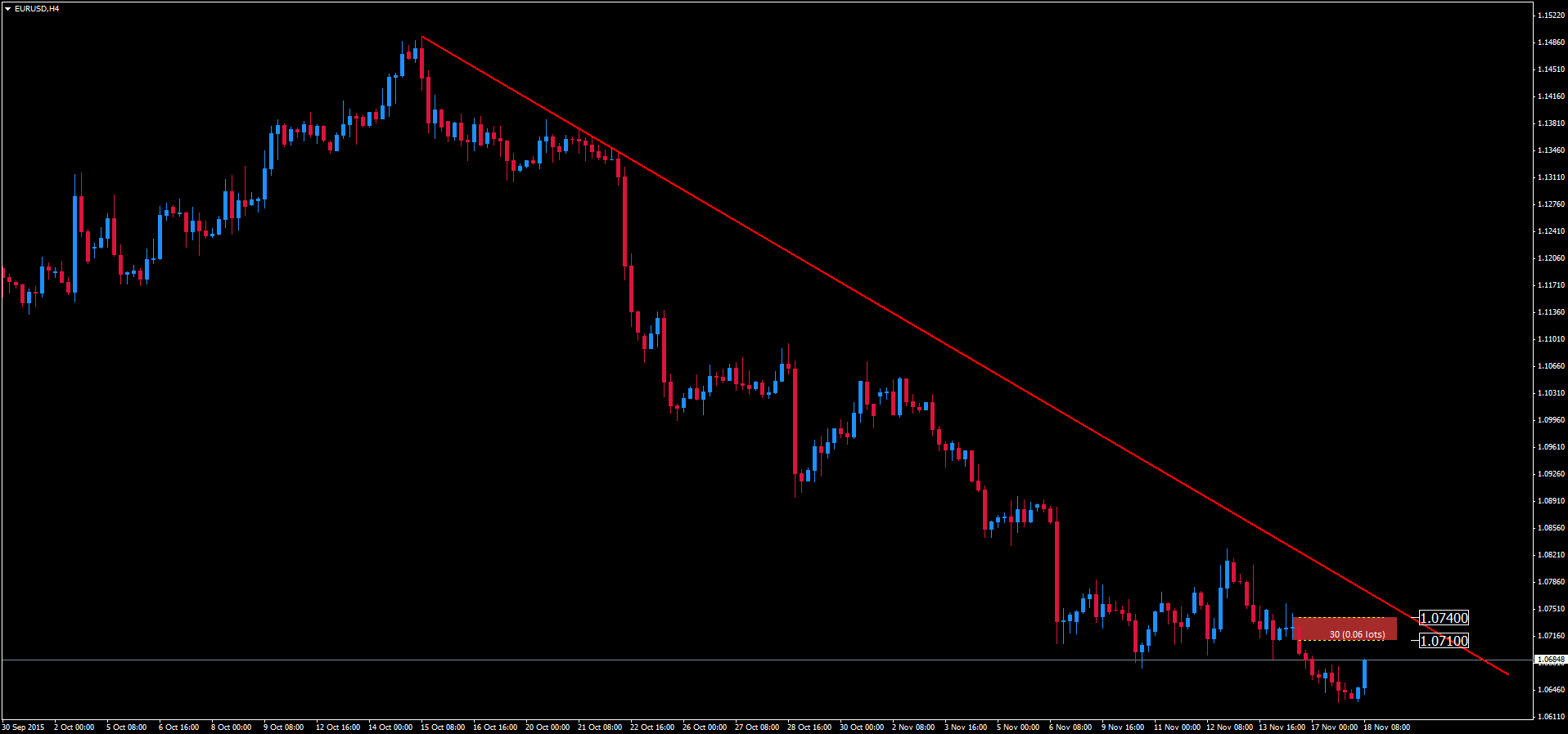 Kontynuacje trendu spadkowego na interwale czterogodzinnym wspiera długoterminowa linia trendu spadkowego oraz strefa oporu w okolicy 1,071-1,074. Za kontynuacją osłabiania się euro przemawiają również plotki płynące na temat obniżki stopy depozytowej przez EBC na najbliższym posiedzeniu.