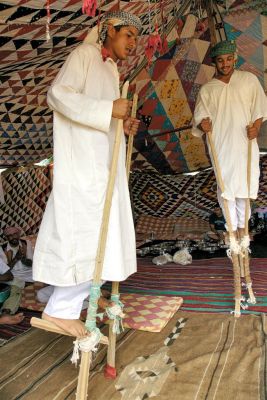 Większość życia podczas festiwalu toczy się pod wielkimi namiotami. Koniec października na pustyni nie jest wolny od słońca i wysokich temperatur. Festiwalowe namioty są wielkie i białe. Dają wszystkim zbawczy cień i są miejscami różnych prezentacji. Te rozstawione w obozowiskach są tradycyjnie wykonane z wielbłądziej wełny. W festiwalowych można oglądać wyroby rękodzieła arabskiego: od broni po zabawki i biżuterię. W kolejnym prezentowane są tradycyjne stroje oraz dywany i kobierce powstające m.in. z wielbłądziej wełny. Tu pod czujnym okiem mistrza można nauczyć się sposobów ich wytwarzania. Jest też namiot - muzeum wielbłądów, namiot poetów (docenią to raczej osoby znające język arabski) oraz namioty gdzie przeprowadza się prezentacje medycyny naturalnej i pustynnej nawigacji. Doświadczeni przewodnicy opowiadają o samochodowych wyprawach przez pustynię a fotografowie z Kairu pokazują zdjęcia wyko- nane podczas podróży po Egipcie.