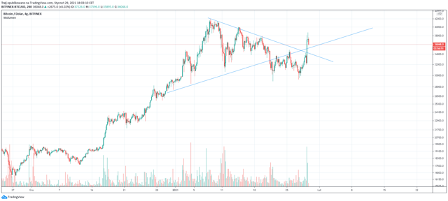 Jeszcze tuż po godz. 9 kurs bitcoina wynosił ok. 32 tys. dolarów, by po godzinie wzrosnąć do ok. 38 tys. dolarów. Po godz. 13 kurs bitcoina, po lekkiej korekcie, zbliża się do 37 tys. dolarów. Po południu korekta dzisiejszych wzrostów pogłębia się i o godz. 18 kurs bitcoina kształtuje się na poziomie 35,8 tys. dolarów, co ogranicza jego dzisiejsze wzrosty do 7,5 proc.