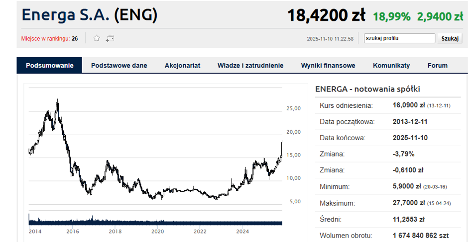 Na ogół spokojny handel akcjami Energii, które z uwagi na niską ich liczbę w wolnym obrocie są wykluczone z głównych indeksów, co przekłada się na niższą płynność handlu i brak większego zainteresowania graczy instytucjonalnych, zmienił się w poniedziałek, 10 listopada, w jeden z bardziej gorących rynkowych tematów.