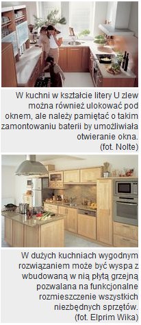 Zlewu nie należy umieszczać centralnie pod oknem, by nie tracić oświetlonego światłem dziennym blatu roboczego. Kuchenkę i lodówkę ustawia się w bocznych ciągach roboczych. Kuchnię otwartą można oddzielić od salonu barkiem lub stołem i mieć dodatkowe miejsce do pracy.