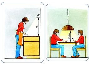 Oprócz wygodnego ulokowania sprzętów ważne jest funkcjonalne rozmieszczenie kuchennego oświetlenia, bowiem wszystkie czynności wykonywane w kuchni wymagają dobrego światła. Podstawą jest dzienne światło wpadające najlepiej przez północne lub wschodnie okno. W średniej wielkości kuchni wystarczy jedna lampa umieszczona tradycyjnie, pośrodku sufitu lub nad stołem.