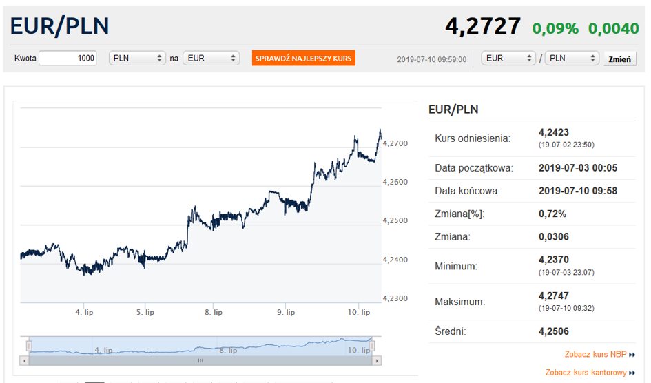 Po 10.00 kurs euro na rynku walutowym kształtuje się powyżej 4,273 zł. Europejska waluta jest tym samym najdroższa od ponad miesiąca (6 czerwca). Przystanek w ostatnim radzie notuje natomiast kurs dolara – blisko 3,81 zł to poziom podobny do wczorajszego i jednocześnie o blisko 8 groszy więcej niż na początku miesiąca.