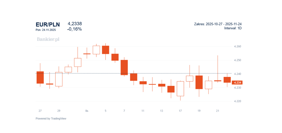 „Ewentualny, pozytywny wydźwięk krajowych danych w połączeniu z mniejszą aktywnością globalnych inwestorów na ostatnich sesjach tygodnia (Święto Dziękczynienia w USA) może skierować kursy EUR/PLN i USD/PLN odpowiednio w stronę 4,2250-4,23 oraz 3,66, co jest dla nas scenariuszem bazowym" - napisali w porannej nocie stratedzy PKO BP. Z kolei W ocenie ekonomistów Banku Millennium notowania złotego mogą utrzymać się w przedziale 4,224-4,244/EUR do końca tygodnia.