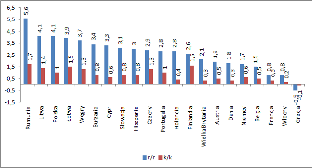 Wśród państw o najwyższej dynamice wzrostu wyróżniają się relatywnie nowi członkowie UE. W zestawieniu dynamiki rocznej niezmiennie lideruje Rumunia (5,6%) – jedyny kraj z wynikiem powyżej 5. Więcej na ten temat w artykule „Rumuńska gospodarka znów zadziwia”.