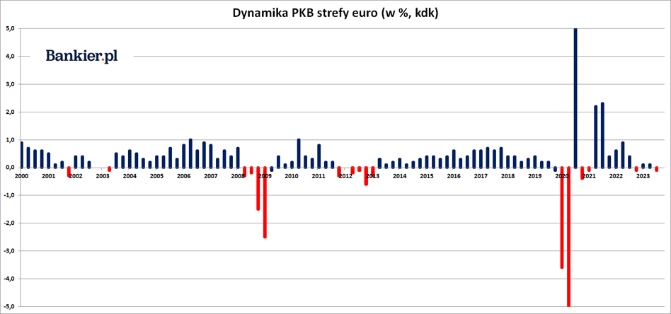 Stało się to po tym, jak w III kwartale PKB eurolandu zanotował spadek o 0,1% kdk. Z kolei pierwsze dwa kwartały 2023 roku przyniosły „wzrosty” PKB po 0,1% kdk, jakie nastąpiły po „spadku” PKB o 0,1% kdk odnotowanym w ostatnim kwartale 2022 roku.