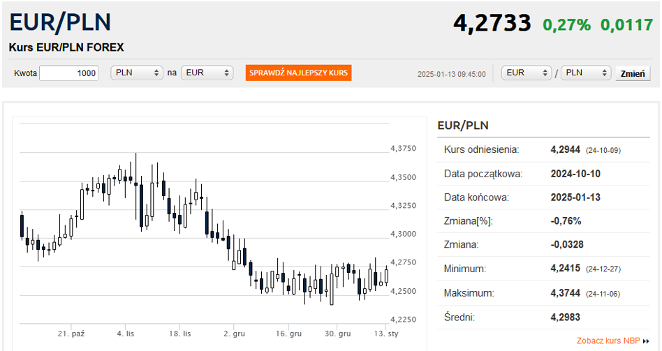 W rezultacie złoty zaczął tracić nawet względem ultra-słabego euro. O 9:45 kurs euro rósł o 1,2 grosza, osiągając poziom 4,2733 zł. W ten sposób para euro-złoty znalazła się blisko górnego ograniczenia trwającej od początku grudnia konsolidacji. W jej ramach kurs EUR/PLN porusza się w przedziale 4,24-4,28 zł, utrzymując się blisko najniższych poziomów od niemal 5 lat.
