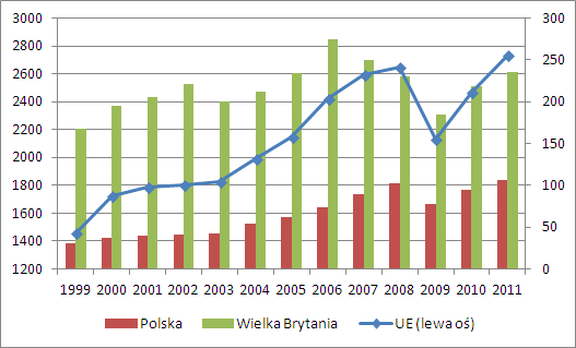 Wartość eksportu Polski, Wielkiej Brytanii i Unii Europejskiej od 1999 roku (dane w mld euro). Źródło: Eurostat