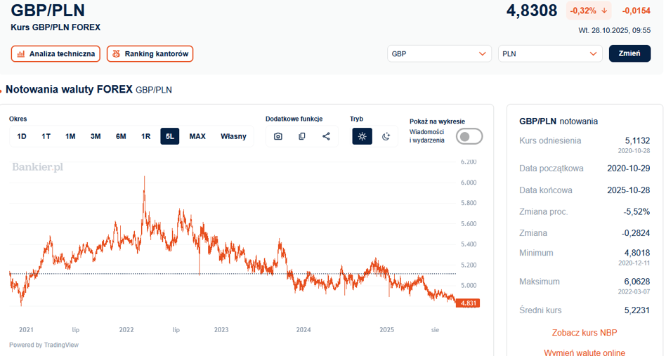 Frank szwajcarski wyceniany był bez większych zmian na 4,5730 zł. Dzięki temu możemy mówić o utrzymaniu konsolidacji w zakresie 4,50-4,60 zł. Funt brytyjski kosztował 4,8308 zł i w ten sposób pogłębił tegoroczne minimum, osiągając najniższy kurs od grudnia 2020 roku.