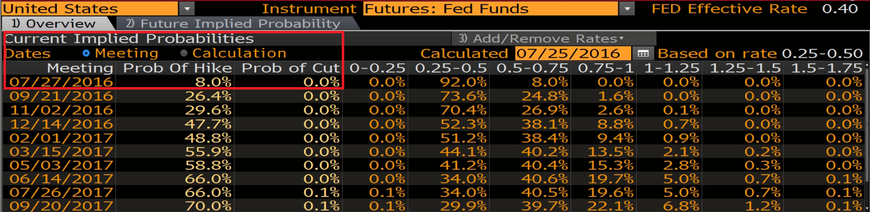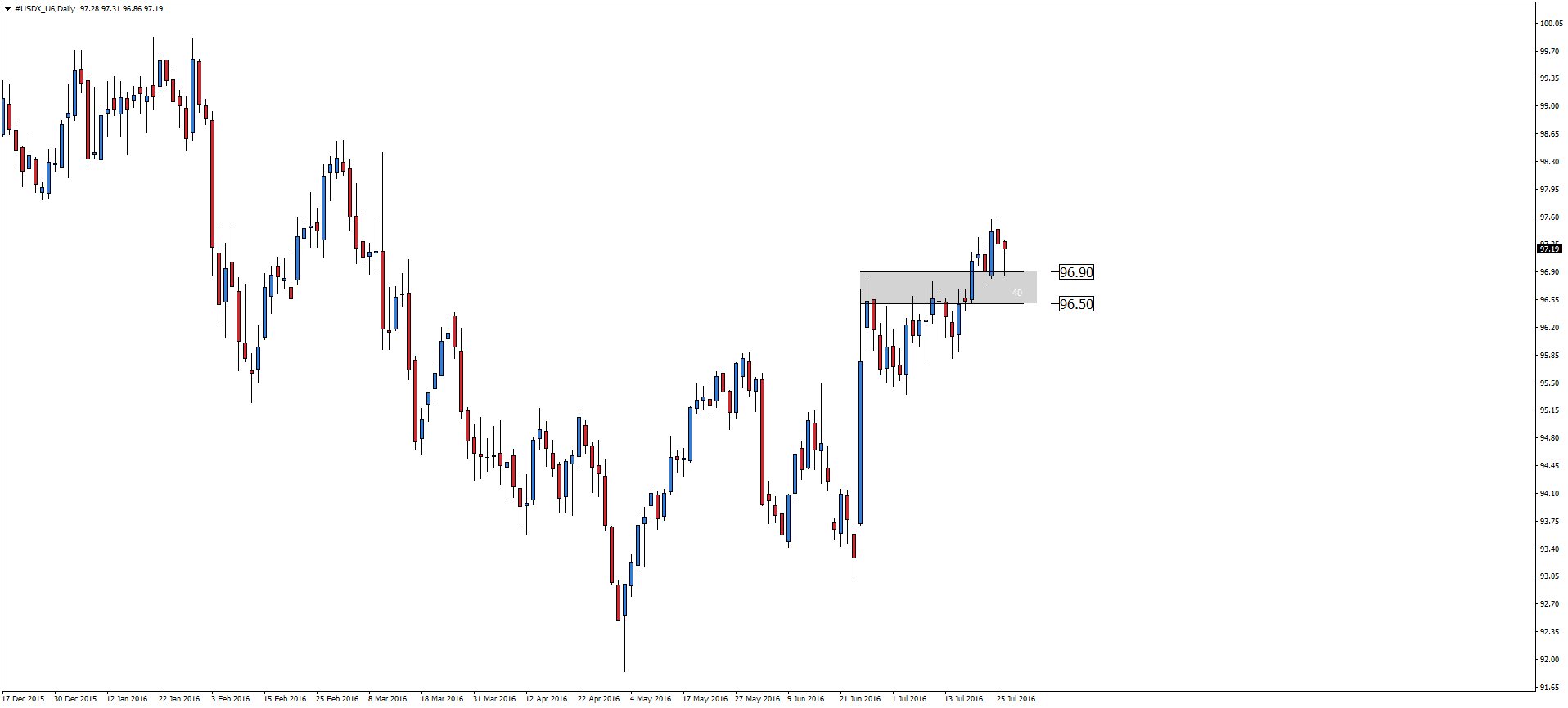 Indeks dolara zdołał pokonać ostatni opór, który ukształtował się w okolicy 96 punktów. Spowodowane to było ostatnimi, bardzo dobrymi informacjami napływającymi z gospodarki amerykańskiej. Analiza fundamentalna na rynku jest mieszana, w długim terminie dolar amerykański powinien być wyprzedawany, ale Brexit zmienił sytuację na rynku walutowym, dolar amerykański od tamtego czasu zyskuje na wartości. Niemniej jednak w środę poznamy koszt pieniądza w Stanach Zjednoczonych. Inwestorzy nie spodziewają się nadzwyczajnych zmian w polityce monetarnej. Uczestnicy rynku na podstawie kontraktów terminowych dają jedynie 8% prawdopodobieństwo podwyżki stóp procentowych na najbliższym posiedzeniu.