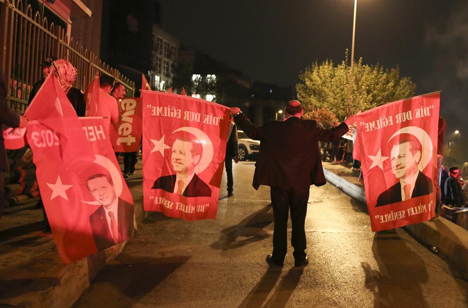 Prezydent Turcji Recep Tayyip Erdogan ogłosił w reakcji na tę wiadomość, że za zmianami ustrojowymi w państwie opowiedziało się 25 mln obywateli. Zaznaczył, że Turcy podjęli "historyczną decyzję". W pojednawczym tonie, po kampanii, która zaostrzyła polaryzację tureckiego społeczeństwa, podziękował wszystkim obywatelom za zwiększenie uprawnień głowy państwa. Prezydent zwrócił też uwagę na fakt, że do jego sukcesu w referendum przyczynili się Turcy mieszkający za granicą, gdzie głosowanie odbyło się wcześniej.