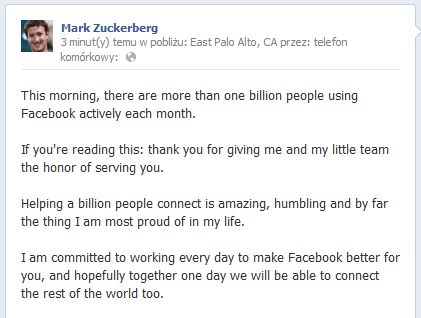"Dziś rano okazało się, że mamy ponad miliard aktywnych użytkowników Facebooka miesięcznie. Jeśli to czytasz: dziękuję ci i czuję się zaszczycony, że ja i mój mały zespół możemy ci służyć. Pomaganie miliardowi osób w utrzymywaniu kontaktów jest niesamowite, to zdecydowanie mój największy powód do dumy. Czuję się zobowiązany pracować nad Facebookiem każdego dnia, by ulepszać go dla was. Mam nadzieję, że pewnego dnia uda nam się razem połączyć także z resztą świata" - napisał Mark Zuckerberg.