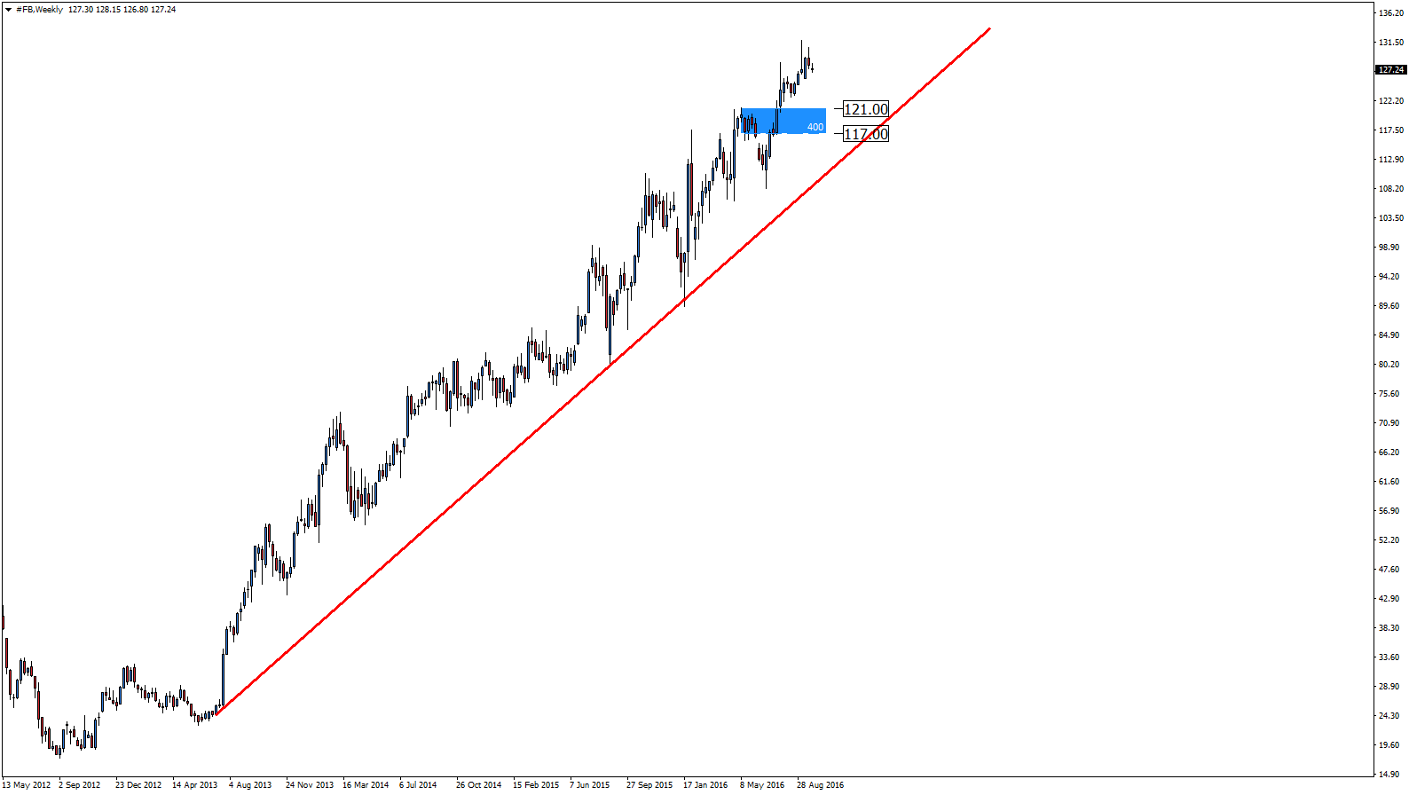 Największy na świecie serwis społecznościowy rośnie jak na drożdżach. Mowa tutaj o Facebooku, który od początku roku zanotował 22% stopę zwrotu. Dla porównania indeks S&P 500 w tym samym czasie wzrósł o niespełna 5%. Trend wzrostowy został wykreowany już w 2014 roku, trwa do dnia dzisiejszego. Nic nie wskazuje na jego przerwanie, jednakże inwestorzy powinni mieć się na uwadze. Spółki zbyt popularne, rosnące o wiele szybciej niż cały rynek są również najbardziej spadającymi podczas paniki. Pomimo tego na dzień dzisiejszy trend wzrostowy powinien się utrzymać. Aktualnym celem kupujących jest psychologiczny poziom 140. Jeżeli doszłoby do korekty, to powinna zatrzymać się w okolicy tygodniowego poziomu wsparcia 117-121.