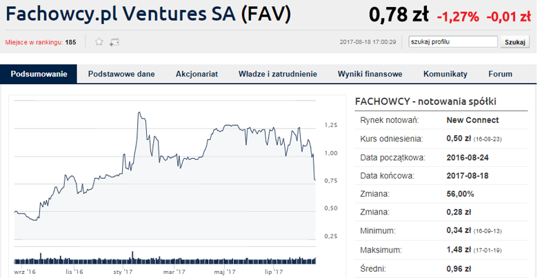 Wydaje się więc, że przez blisko rok spółka była notowana nienaturalnie wysoko w stosunku do rzeczywistej wartości, jaką przypisywali jej inwestorzy. Tym bardziej, że wcześniejsze wzrosty kursu wydawały się oderwane od fundamentów. Ostatni zysk Fachowcy osiągnęli w 2013 roku. Przychody z lat 2014-2016 łącznie były niższe niż te zanotowane we wspomnianym 2013 r. Gwałtownie spadła też wartość aktywów (13,3 mln zł w 2016 r. vs 23,7 mln zł w 2013), a w 2015 r. spółka zanotowała ujemne (!) kapitały własne, które powróciły też w ostatnim raporcie (II kwartał 2017). Licząc po wczorajszej cenie, spółka jest notowana przy C/WK na poziomie 67 i C/Z równym 119.