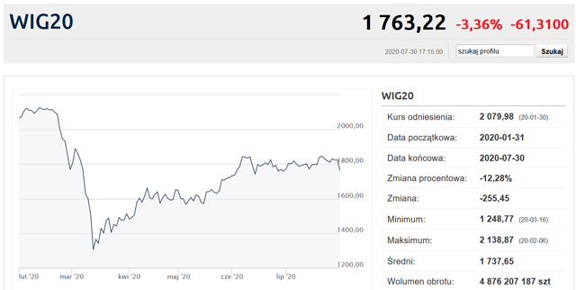 Kluczem do zinterpretowania wydarzeń na warszawskim parkiecie może być sytuacja w Niemczech. Nasi zachodni sąsiedzi pokazali dziś rekordowo słabe i jednocześnie gorsze od oczekiwań dane o PKB w drugim, naznaczonym pandemią kwartale. Niemiecki DAX (-3,45 proc.) był dziś jednym z najsłabszych indeksów w Europie. Niestety, pod tym względem dorównywały mu jedynie WIG20 (-3,36 proc.) oraz WIG (-3,88 proc.).