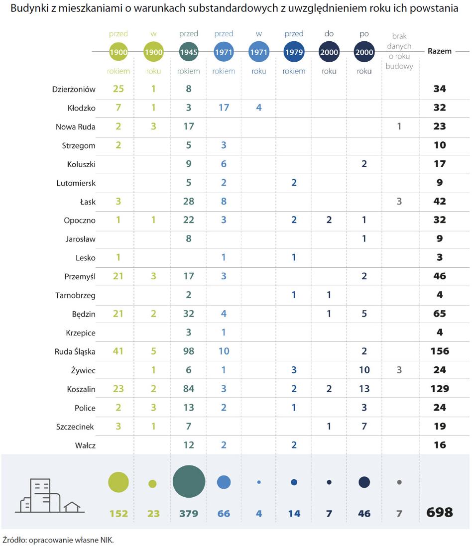 Według stanu na koniec 2021 r., budynki z mieszkaniami o niskim standardzie stanowiły ponad połowę zasobu mieszkaniowego skontrolowanych gmin. Na blisko 700 budynków aż 554 powstało jeszcze przed 1945 r., z tego co trzeci jeszcze w XIX wieku.
