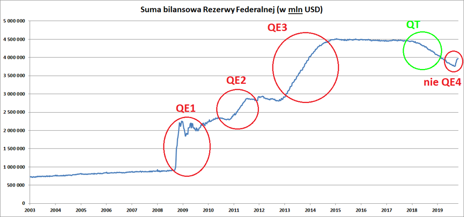 Od września Fed zmuszony jest regularnie pompować w sektor bankowy dziesiątki miliardów dolarów w ramach nadzwyczajnych operacji repo. W zeszłym tygodniu tylko jednego dnia nowojorski oddział Rezerwy Federalnej dostarczył bankom 134 mld dolarów. Teoretycznie nie jest to „dodruk pieniądza” – czyli QE – ponieważ, Fed nie kreuje nowego pieniądza. Ale w praktyce regularne repo o tak dużej skali utrzymujące się przez dłuższy okres czasu skutkują zwiększeniem sumy bilansowej banku centralnego USA i mają podobny efekt jak QE.