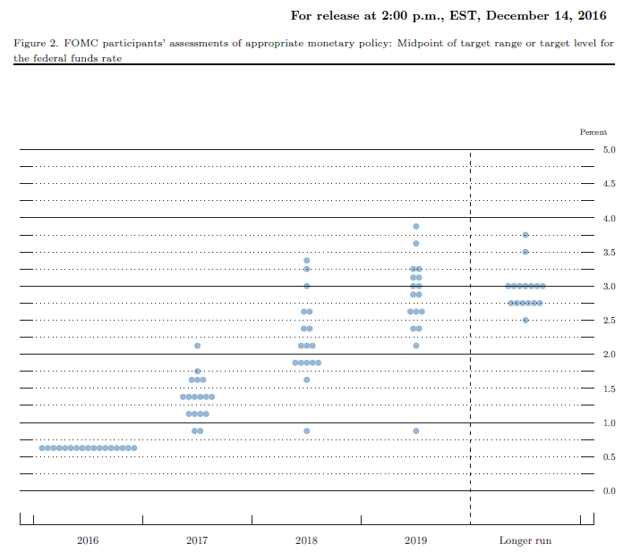 Z grudniowego komunikatu FOMC wypadła jakakolwiek wzmianka sugerująca termin kolejnej podwyżki. Jednak członkowie Komitetu zmienili swoje nastawienie na nieco bardziej „jastrzębie”: na 2017 rok planują trzy podwyżki (po 25 pb. każda), a nie dwie jak wynikało to z projekcji wrześniowej.