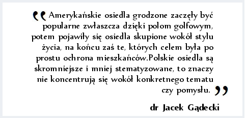 Wiele zależy od dalszej popularności tego typu oferty mieszkaniowej. Wydaje się, że pierwsze zachłyśnięcie zamkniętymi osiedlami już za nami. Dr Gądecki przypuszcza jednak, że na tym nie koniec. Na pytanie o przyszłość grodzonych osiedli w Polsce odpowiada: - Myślę, że trend się utrzyma, choć już pojawiają się pierwsi rozczarowani, pierwsze wydarzenia i sytuacje, które zaczynają uświadamiać mieszkańcom, że kupowali raczej marzenia niż realny produkt.