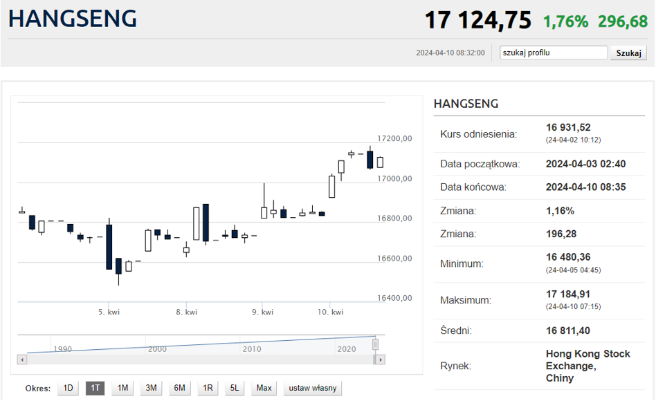 W momencie pisania tego tekstu, na finiszu sesji na giełdzie w Hongkongu, jej główny indeks giełdowy umacniał się o 1,76%. Indeks Shanghai Composite tracił 0,76%, a Shanghai B-Share spadał o 0,06%.
