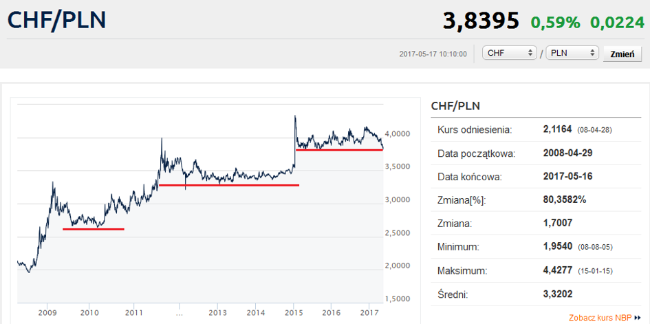 Tym bardziej, że od roku 2008 na parze frank-złoty obserwujemy powtarzający się schemat: frank szybko drożeje przez kilka miesięcy, po czym następuje dłuższy okres konsolidacji na podwyższonym poziomie. Obecny (względnie) spokojny okres trwa już ponad dwa lata.