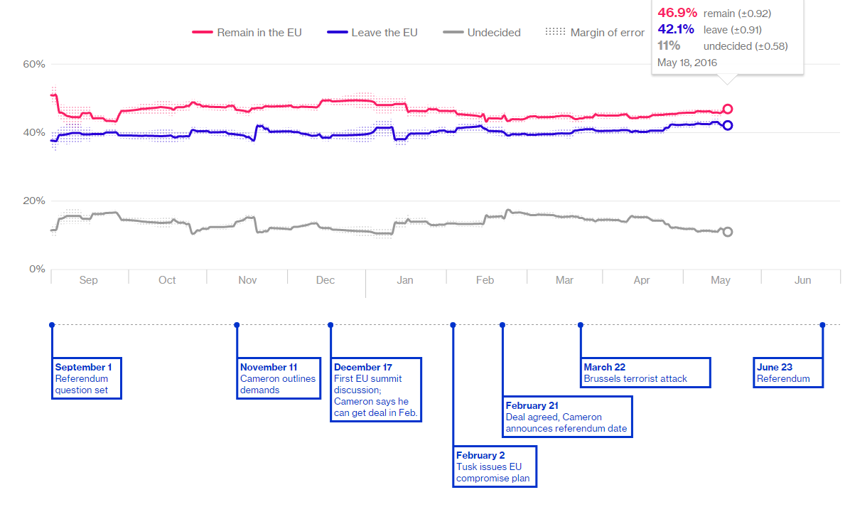 Aktualne sondaże przeprowadzone przez agencję informacyjną Bloomberg wskazują na małą przewagę obywateli pragnącymi pozostać w strukturach UE. 46,9% jest za, 42,1% jest przeciw, a 11% osób jest niezdecydowanych.