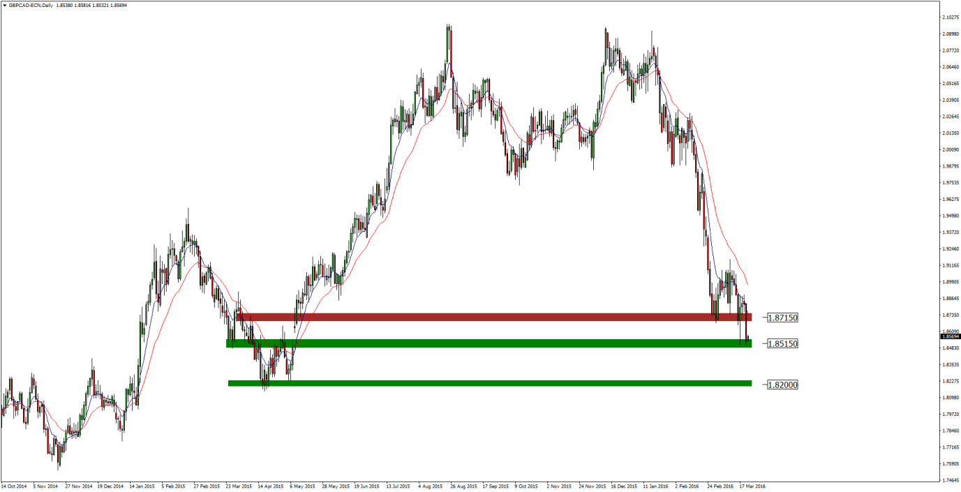 Od połowy stycznia br. obserwujemy silny trend spadkowy na parze GBP/CAD. Wczoraj kurs przełamał poziom 1,8715 i dotarł do kolejnego wsparcia w pobliżu 1,8515. Przełamanie tego obszaru otworzy drogę do dołków z kwietnia i maja ub.r. w okolicach 1,82. Z kolei dzisiaj trwa korekta wzrostowa, a wspomniana strefa 1,8715 powinna obecnie pełnić rolę poziomu oporu.