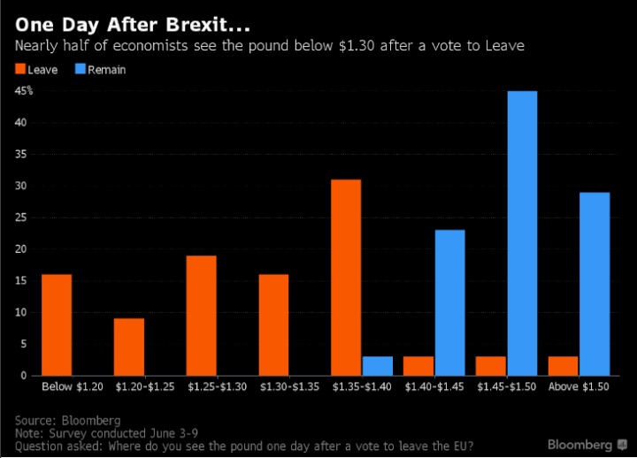 Według ankiety przeprowadzonej przez Bloomberga wśród ekonomistów wynika, że większość z ankietowanych osób w przypadku Brexit-u widzi parę walutową poniżej 1.35, w przypadku pozostania w Unii Europejskiej na poziomie 1.50. Jest to bardzo realny scenariusz, aczkolwiek musimy pamiętać o Bankach Centralnych, które z dużym prawdopodobieństwem wkroczą do interwencji.