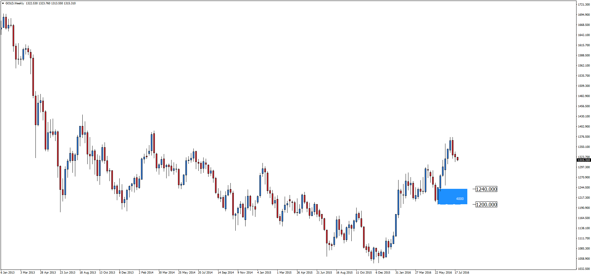 Złoto w dalszym ciągu znajduje się w korekcie ostatnich, bardzo mocnych wzrostów. Kilkuprocentowa korekta jest wskazana , jeżeli dochodzi do mocnych trendów bez korekty, to możemy spodziewać się w najbliższej przyszłości załamania trendu. Aktualnym celem sprzedających na interwale tygodniowym może być strefa popytu 1200-1240.