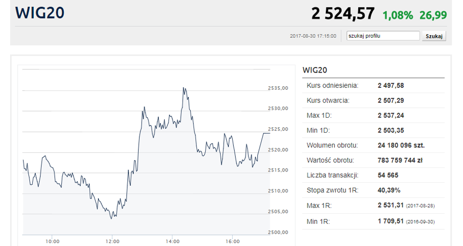 Po dniu przerwy na GPW powróciły wzrosty. W trakcie sesji WIG20 ustanowił nawet maksima hossy i po raz kolejny pokazał, że w końcówce sierpnia należy do najmocniejszych europejskich indeksów.