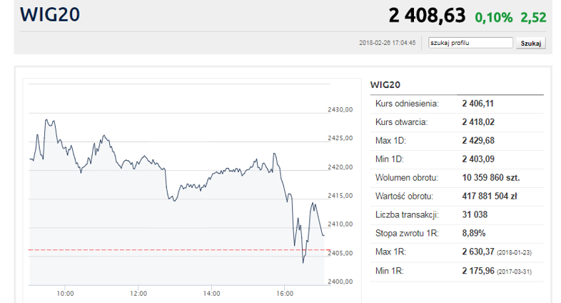 | WIG 20 | Polska | 2408,63 | 0,10 | 0,01 | -7,38 | 8,89 | -2,14 |