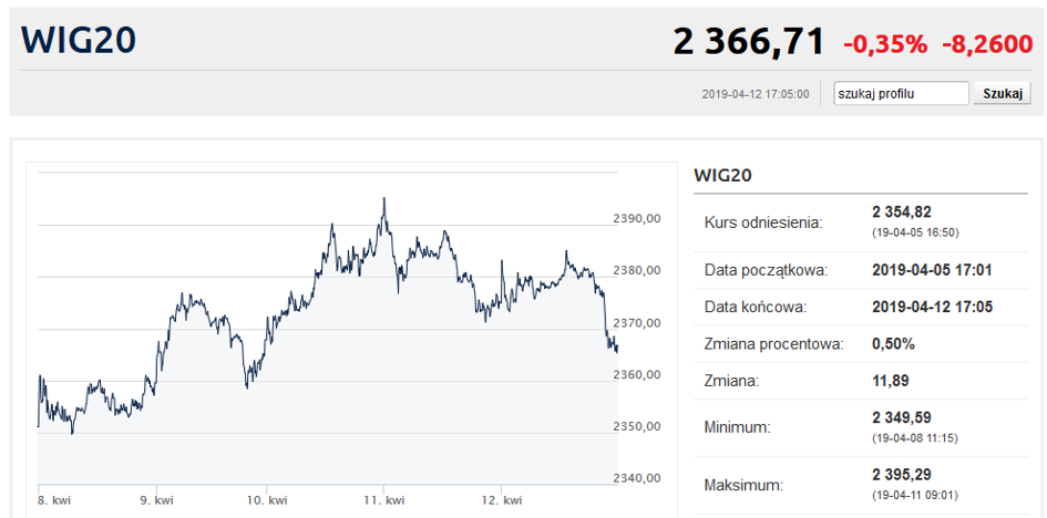 Przez większość piątkowych notowań WIG20 utrzymywał się na niewielkim plusie. Gwałtowne zejście pod kreskę nastąpiło dopiero przed 16.00, co łączyć można z pojawieniem się inwestorów z USA na polskim rynku. Koniec końców główny indeks GPW stracił dziś 0,35 proc. i zakończył dzień na poziomie 2366,71 pkt. W perspektywie całego tygodnia mieliśmy do czynienia ze wzrostem o 0,66 proc. To wynik wyraźnie niższy od odnotowanego w pierwszym tygodniu kwietnia (1,7 proc.).