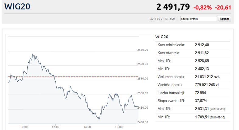 | WIG 20 | Polska | 2491,79 | -0,82 | -0,97 | 4,34 | 37,67 | 27,92 |