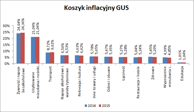 Jak co roku, GUS dokonał zmian w koszyku inflacyjnym. Zmian tych dokonuje się w oparciu o badanie budżetów gospodarstw domowych. W najnowszym zestawie wag widać nieznaczny spadek znaczenia żywności i napojów bezalkoholowych, transportu oraz restauracji i hoteli. Największy wzrost znaczenia odnotowano w rekreacji i kulturze.